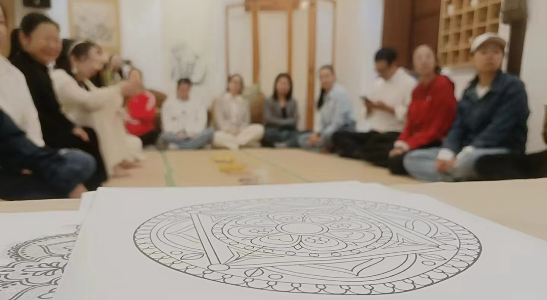 在优美的音乐声中,每个人都沉浸在思绪与色彩的交互之中、心灵与图案的碰撞之中,感受着情绪通过色彩与图形在指间慢慢流淌,体悟着曼陀罗的奥妙与治愈……